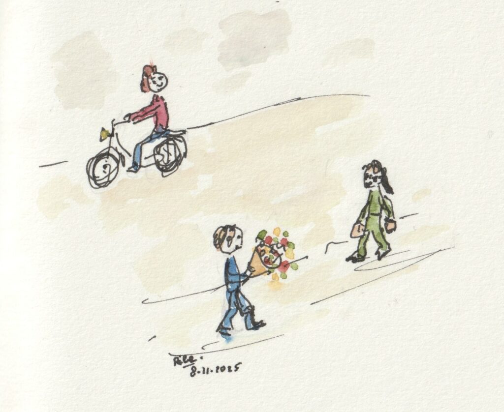 Vandaag loop ik met een mooi boeketje bloemen naar huis. Iedereen kijkt naar die vrolijke kleuren op deze mistige dag, glimlacht even of zegt iets aardigs. Volgens de reclame houden bloemen van mensen, maar volgens mij is het andersom.