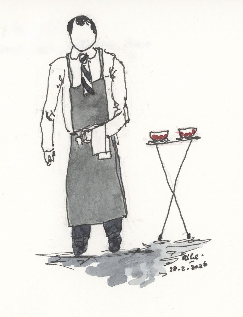 De ander, die uitserveert, heeft een schort met bovenin een brievenbusje waarin zijn stropdas verdwijnt. Een praktische oplossing, zo komt de das nooit in soep of saus terecht.